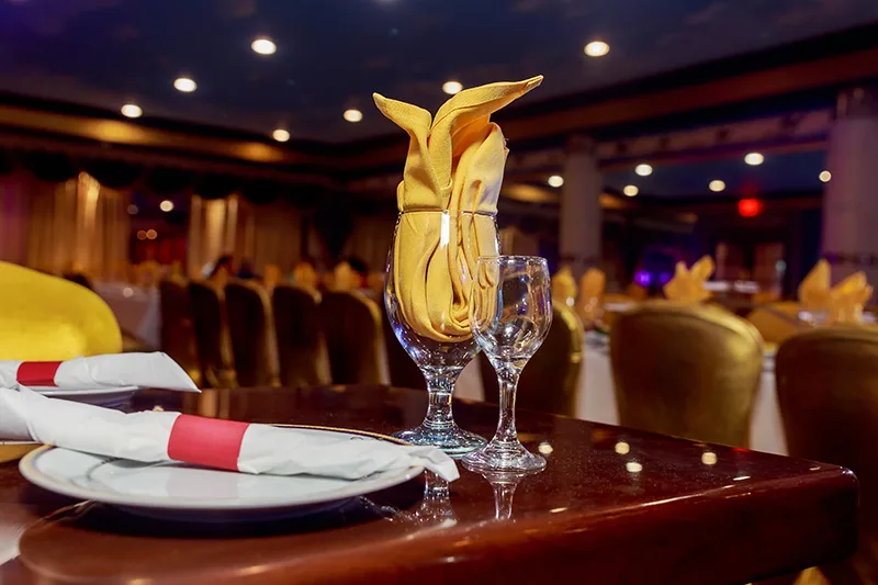 The boat departs, and guests take their seats for dinner service. Cairo’s illuminated skyline comes into view.