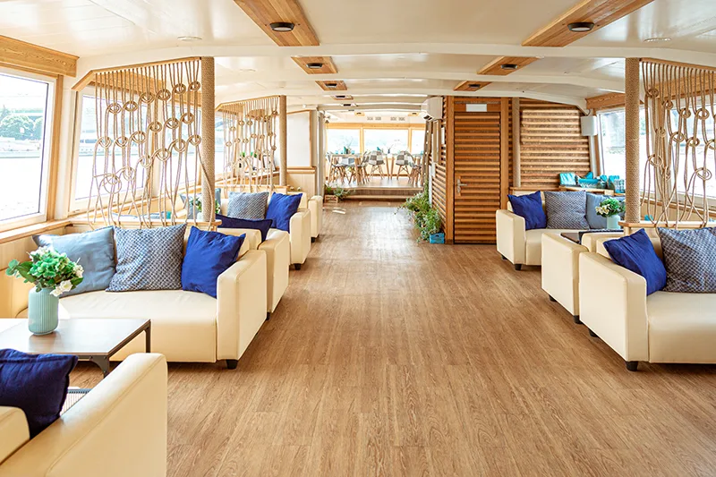 The evening begins with a warm welcome as the boat departs, gliding past Cairo’s illuminated skyline and iconic bridges. Guests are seated for a lavish open buffet dinner, offering a wide selection of Egyptian and international dishes freshly prepared onboard. The setting is both elegant and relaxed, perfect for couples seeking a romantic evening, families enjoying a night together, or groups celebrating a special occasion.