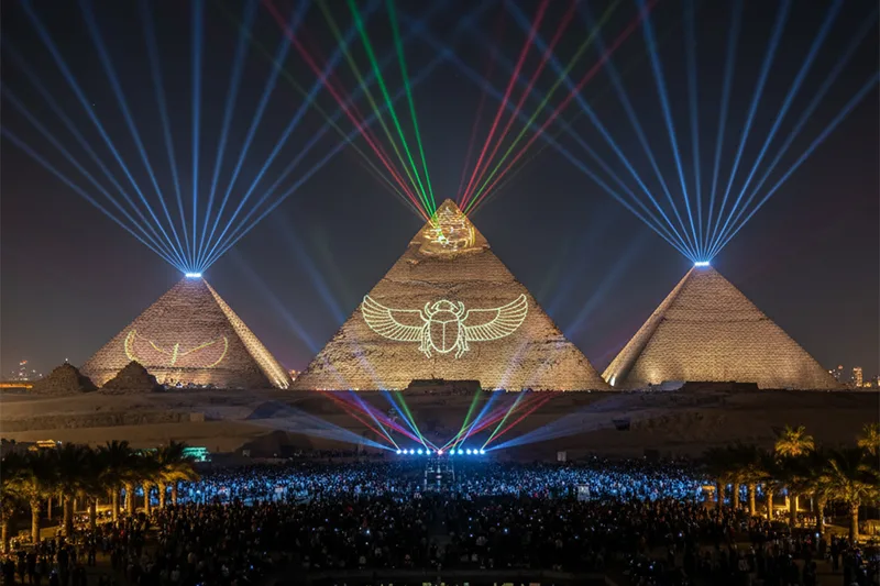 Watch as the Sphinx narrates the history of ancient Egypt, with the pyramids illuminated by colorful lights and laser projections.